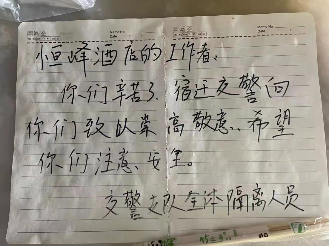 另外還接收一批特殊的人,那就是宿遷市援連返宿的127名交警,他們從一線回來,身體和心理都受到了巨大的考驗。施永成在他們接受醫(yī)療觀察的同時,也對他們進行了心理疏導,讓他們順利結束醫(yī)學觀察重返抗疫崗位,并收到他們的感謝信。