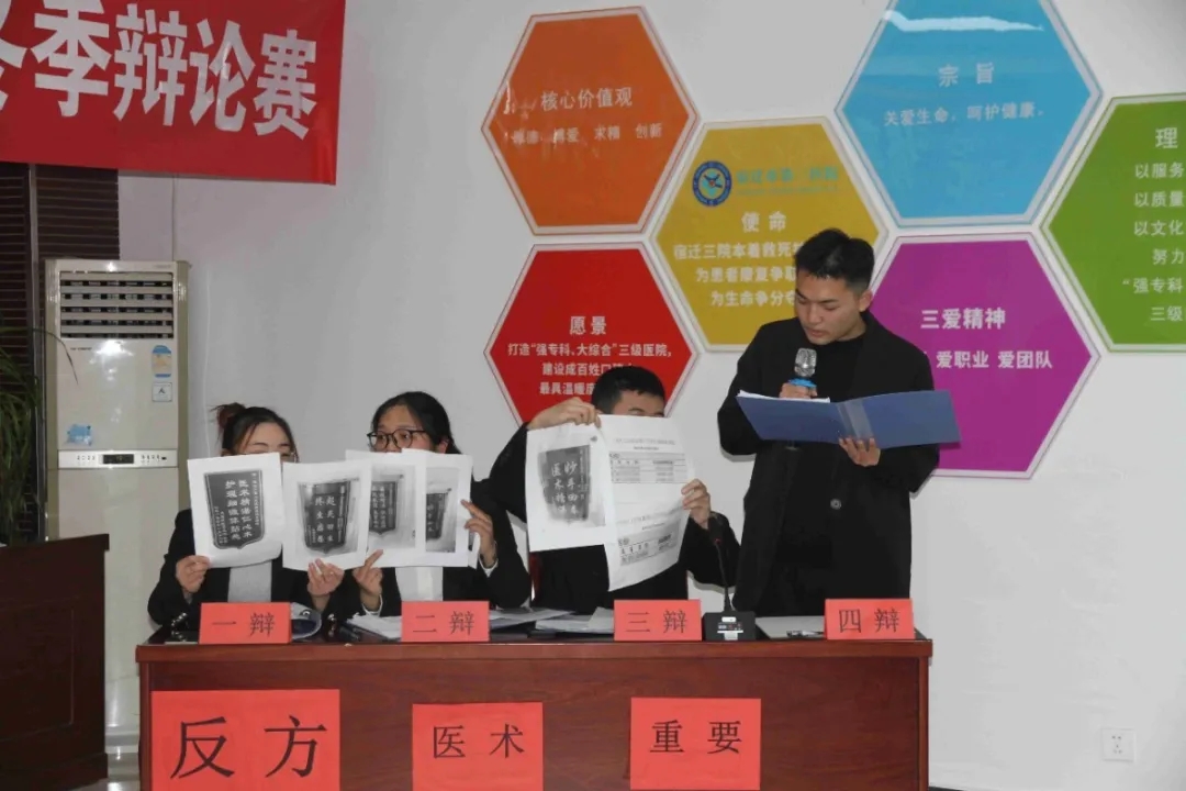 最后評委一一對本次辯論賽進行點評, 對本次活動以及選手的表現(xiàn)給予了肯定,在豐富大家文化生活的同時,讓大家對自己的職業(yè)本身也能有更深刻的思考和認識。辯論賽的真正意義不是去爭辯一個真理,獲得一個結(jié)果,而是強迫你站在一個角度去認真思考問題,更多的是怎么去深入地挖掘事物的本質(zhì),能鍛煉到我們的思辨能力,如思考問題的深度、臨場反應的能力。醫(yī)本仁術(shù),德乃醫(yī)本,醫(yī)德和醫(yī)術(shù),如車之兩輪,鳥之雙翼,缺一不可。作為醫(yī)護人員,為構(gòu)建和諧醫(yī)患關(guān)系,醫(yī)德與醫(yī)術(shù)都應該不斷精益求精,不斷提升服務(wù)水平和醫(yī)療質(zhì)量,繼承發(fā)揚我國傳統(tǒng)文化。