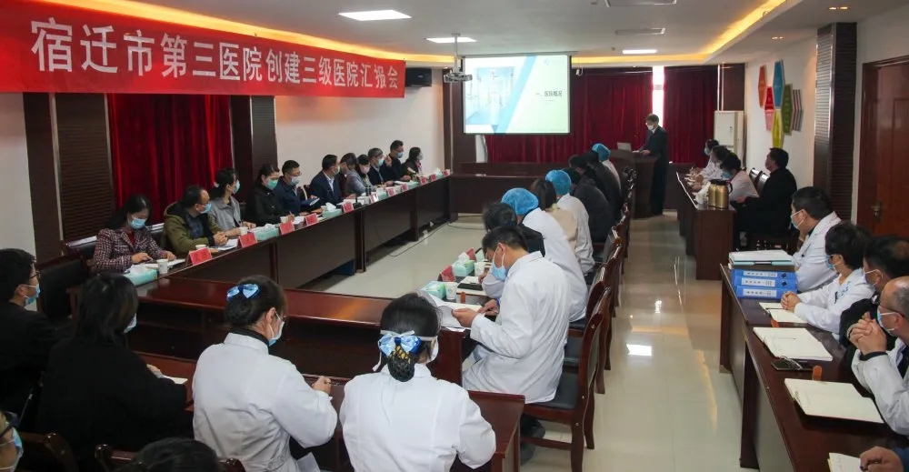 31日上午,在我院四樓會議室進行宿遷市第三醫(yī)院創(chuàng)建三級醫(yī)院匯報會。市衛(wèi)健委醫(yī)政醫(yī)管處處長張志猛主持會議,宿遷市第三醫(yī)院創(chuàng)建顧問周東浩致歡迎辭并進行了創(chuàng)建工作匯報。評審專家組由市中醫(yī)藥管理局副局長顏紅同志帶隊,淮安市第三人民醫(yī)院院長范智勇等五名專家和我市衛(wèi)健委共15名專家,分金亭醫(yī)院集團董事長胡道虎先生和我院全體領(lǐng)導(dǎo)班子及迎評組成員共同參加了會議。